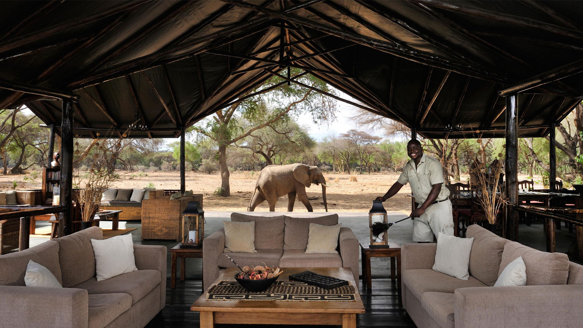 Overlooking a maze of islands inhabited by hippo, the camp is tucked into a shady acacia grove that frequently attracts elephant