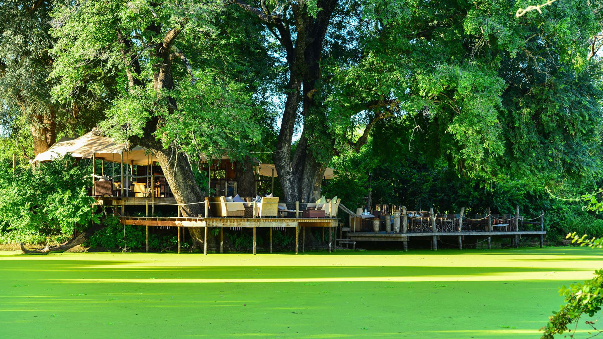 Located on the only private wilderness concession in Mana Pools National Park, the intimate Kanga Bush Camp overlooks a busy waterhole. Each of the six ensuite Meru-style safari tents boasts a comfortable bed, hot bucket shower and flush w.c. The tent’s private veranda is the perfect place to sit back, relax and watch the activity at the busy waterhole. The guest lounge and dining areas are on a raised observation deck that enjoys the shade of some large trees, and guests can also enjoy a refreshing dip in the splash pool.