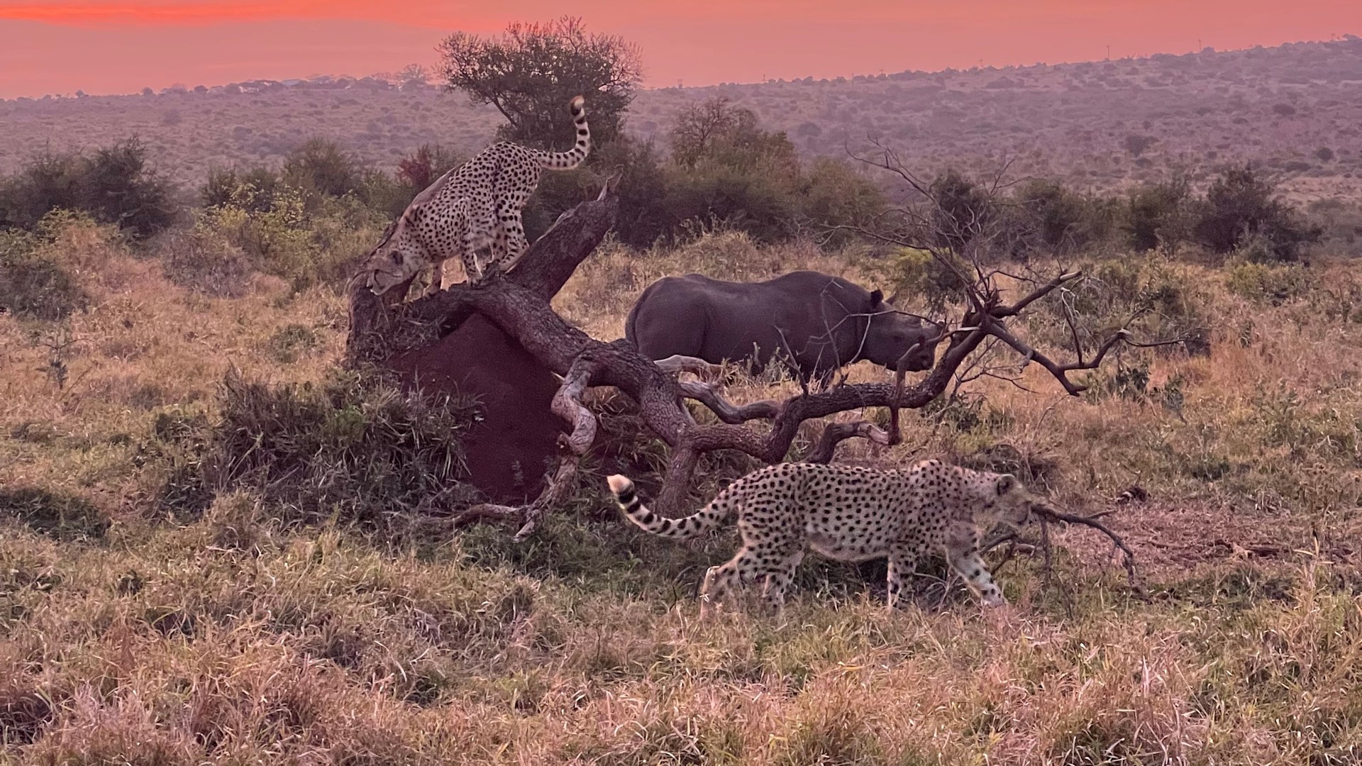 During our last night on safari, our incredible tracker Menzi noticed the movement of two cheetahs far in the distance, right where we had just left a relaxed black rhino. The rhino sighting was rare and special enough, but when we circled back we found that he and the two cheetahs were cautiously curious of each other and exploring the hillside together. They made their way over to a marula tree right as the sky became a beautiful pink sunset. This was the perfect visual of Phinda’s successful conservation efforts, all in one striking moment.